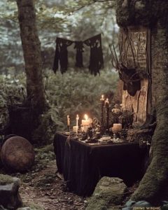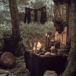 Bosque misterioso con velas al rededor