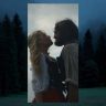 Escena romántica de Cumbres borrascosas donde Heathcliff y Catherine se besan bajo un cielo nublado, rodeados de árboles, simbolizando la pasión y el carácter salvaje de su relación.
