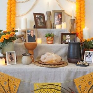 Altar de muertos en tonos amarillos y blancos con fotografías