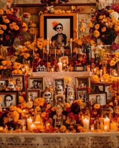 Fotografía en altar de muertos con flores cempasúchil como adorno