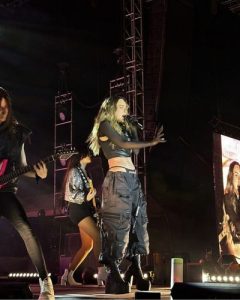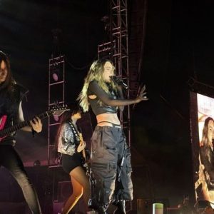 Belinda se encuentra cantando en un escenario con un estilo obscuro