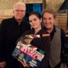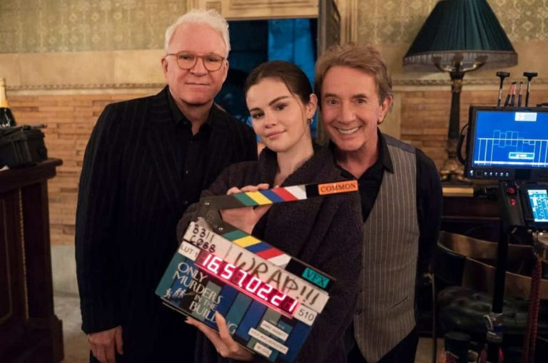 Fotografía del detrás de cámaras donde Selena Gomez, Martin Short y Steve Martin se preparan para grabar nuevas escenas de Only Murders in the Building, mostrando la complicidad y energía del equipo en el set