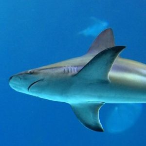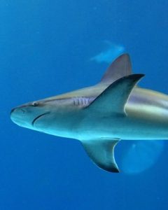 Fotografía de un tiburón en mar abierto, captada durante su desplazamiento natural.