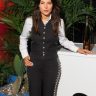 Majo Aguilar en evento vistiendo un traje de mariachi color negro