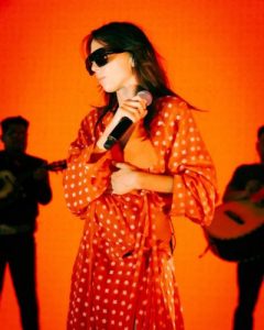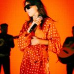 Majo Aguilar Majo Aguilar sobre el escenario, vistiendo un vestido rojo de lunares y lentes oscuros
