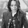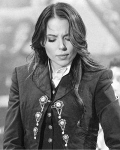 Majo aguilar en traje de mariachi, foto en blanco y negro