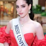 Fátima Bosch usando vestido rojo y banda de Miss Universe México
