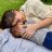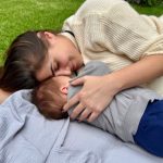 La conductora Sofía Rivera Torres aparece acostada sobre el pasto abrazando a su bebé en una escena familiar y serena