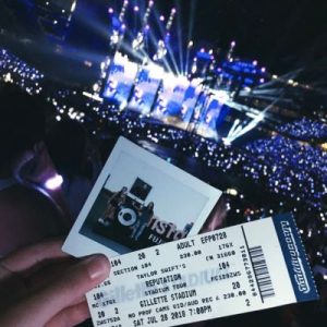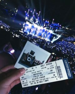 Persona mostrando su boleto de acceso a un concierto mientras al fondo se observa el escenario lleno de luces y público en el Tecate Emblema en el Autódromo Hermanos Rodríguez.