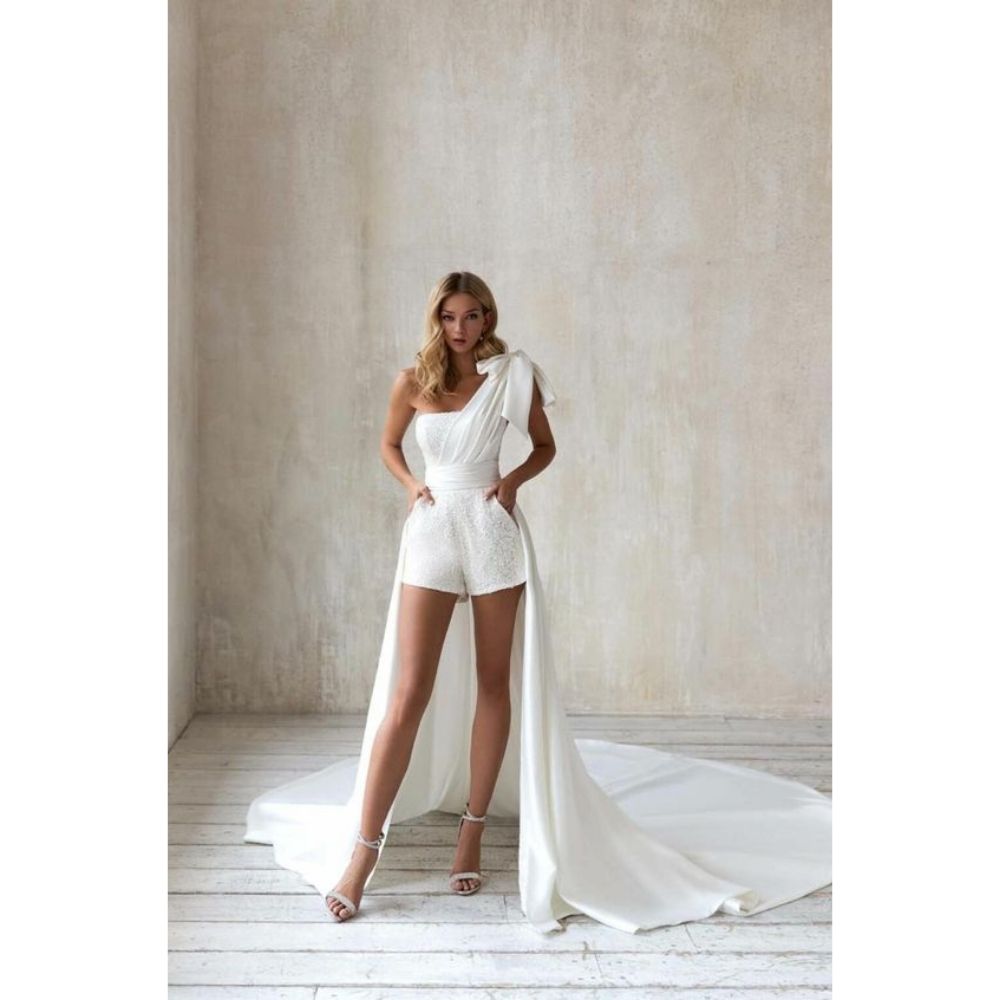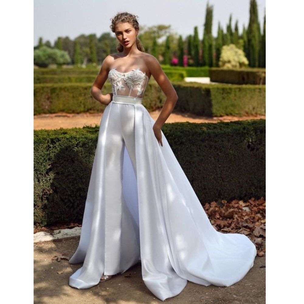 Este estilo de jumpsuit con cauda se ven hermosos, sobre todo si tendrás boda religiosa pero tienes ganas de llevar cauda (así se le llama a la «cola» del vestido). Es una gran opción.