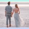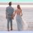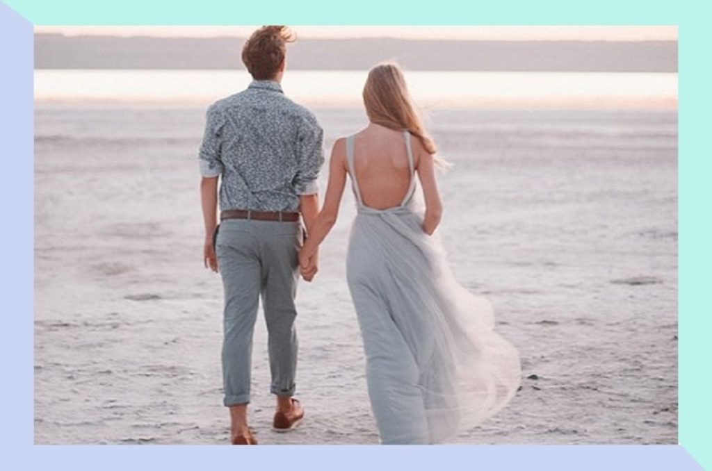 Pareja disfrutando de un paseo por la playa, con el sol bajo en el horizonte, creando un momento romántico e inolvidable frente al mar