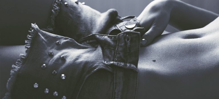Imagen en blanco y negro del abdomen de una chica apunto de autoexplorarse. Masturbarse es una forma de conectar con tu cuerpo, descubrir tus sensaciones y cuidar de ti misma con respeto y bienestar