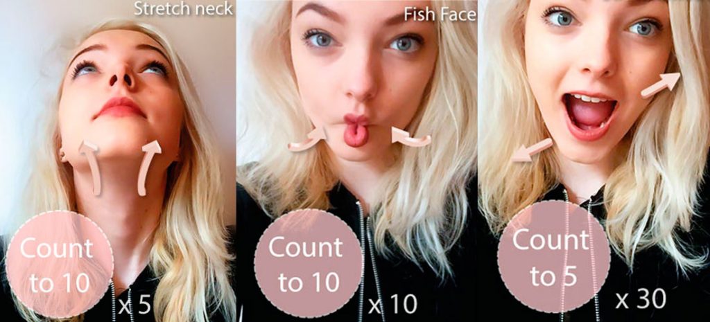 Abre la boca tan amplia como sea posible y mantenga mientras cuenta hasta 5. relajarse y dejarse llevar. Repetir unas 30 veces en la mañana.Para acelerar los efectos del ejercicio lo hacen de nuevo al mediodía y una vez más por la noche antes de ir a dormir. Los beneficios incluyen las mejillas bien formadas y mandíbula, así como los pómulos prominentes y labios bien definidos.