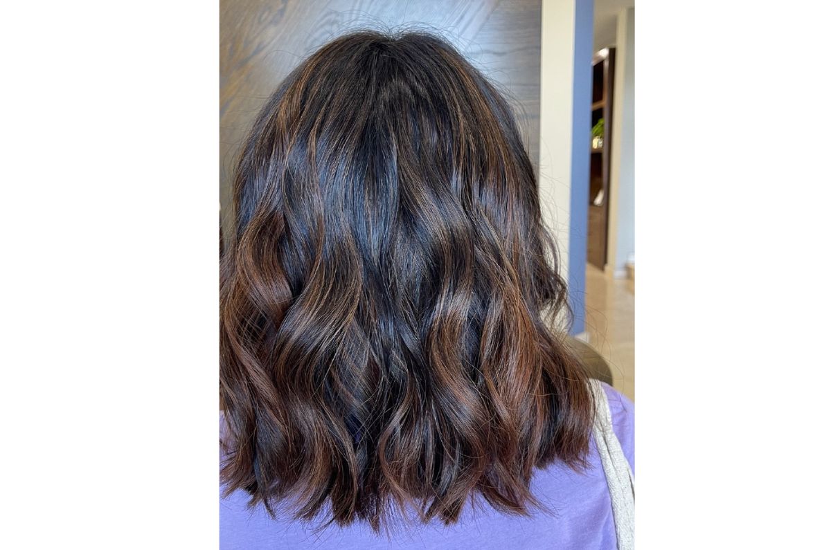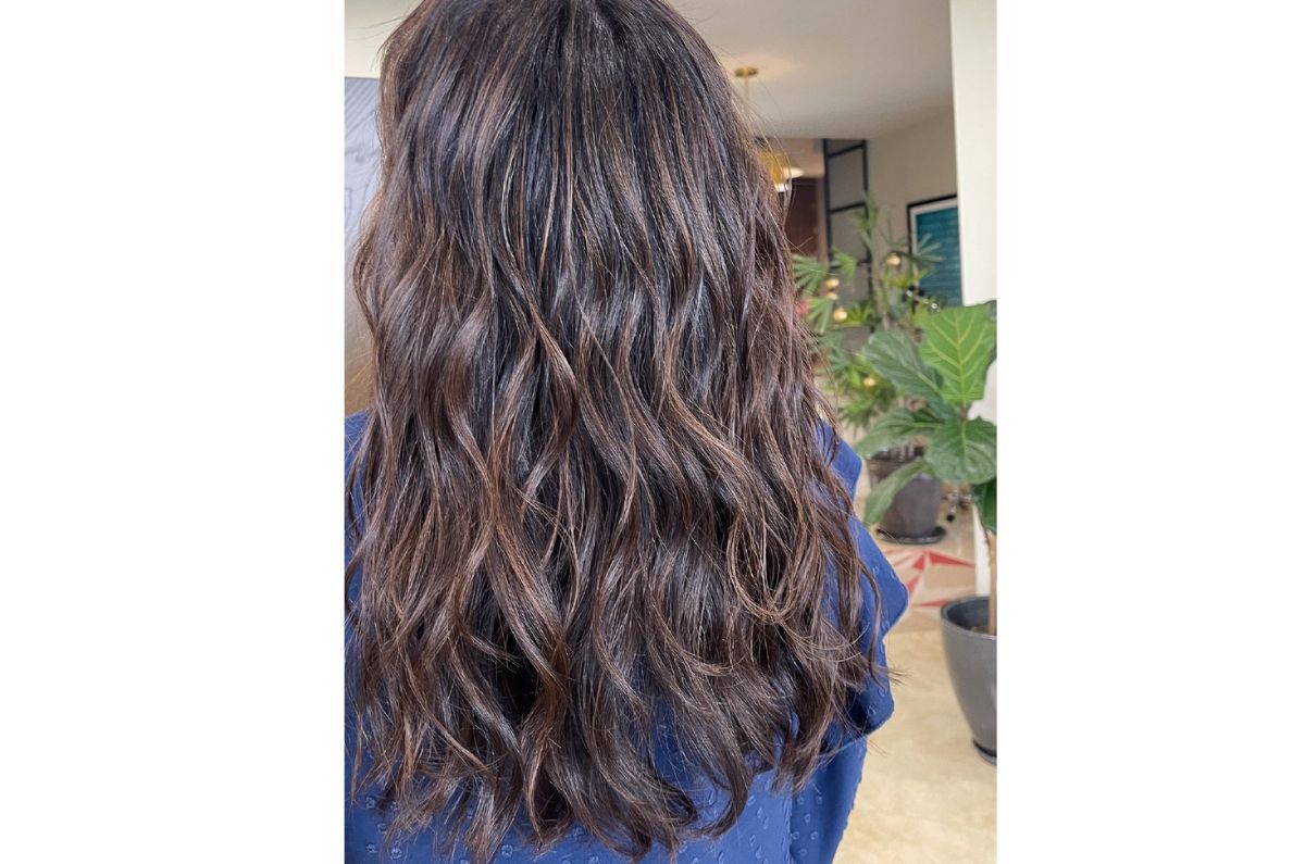 Combinar la riqueza de un color base de chocolate oscuro con la suavidad de un babylight súper pequeño crea una ilusión dentro de las capas del cabello. Lo importante es pedir un color mínimo, apenas visible. Es decir, los reflejos deben ser casi indetectables (solo un medio tono o un tono completo más claro que el color base) para agregar dimensión y definición a los rizos.
