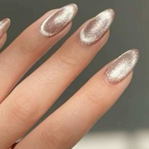 Manicura en dorado con efecto cat eye, un diseño magnético que aporta luminosidad, sofisticación y un estilo llamativo a tus uñas.