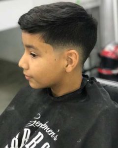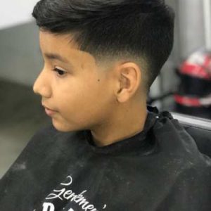 Perfil lateral de un niño con la parte superior del cabello uniforme y los laterales difuminados en degradado, mostrando un corte limpio, fresco y práctico para la escuela.