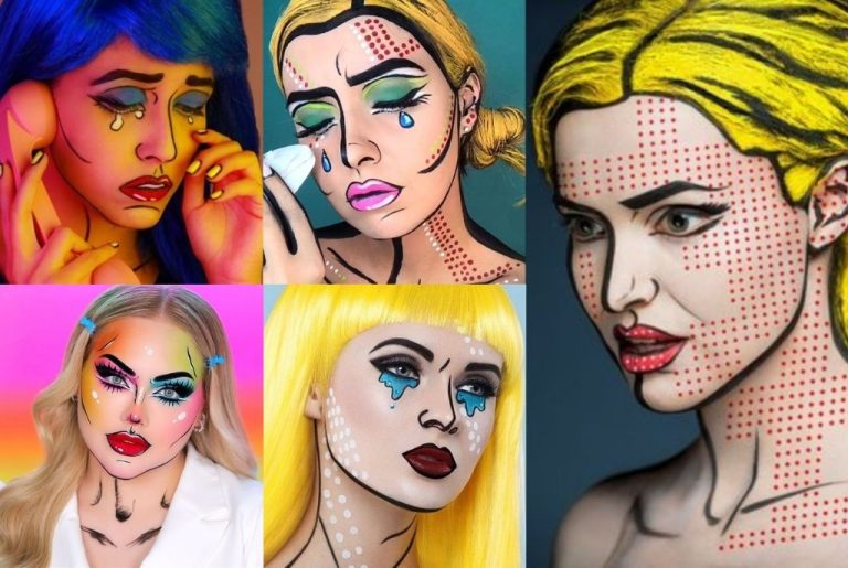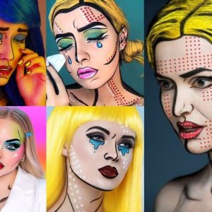 Collage con cinco maquillajes pop art estilo cómic triste, ideal para un look llamativo y expresivo