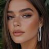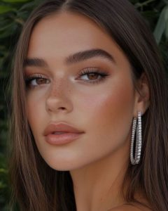 Retrato con maquillaje natural en tonos durazno y nude, piel uniforme con efecto glow sutil, cejas peinadas hacia arriba y labios cremosos. Un look equilibrado que transmite confianza sin exagerar.
