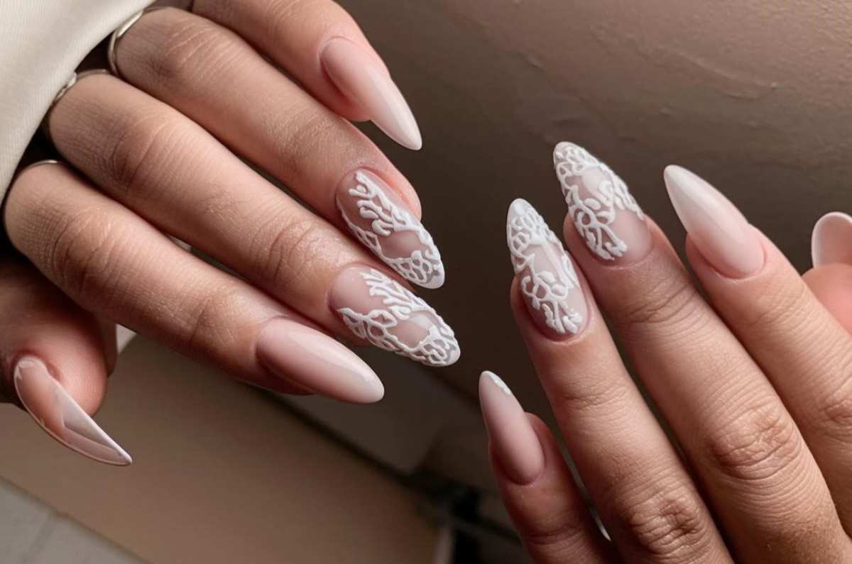 La opción favorita de las novias, la combinación de esmalte blanco con nude o colores pastel, más perlas o pedrería, hace de esta clase de diseños de uñas la opción perfecta para evocar los detalles bordados de encaje de ciertas prendas.
