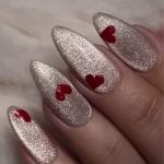 Manicura plateada con efecto cat eye y corazones rojos