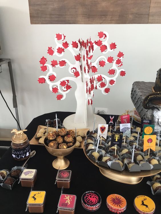 Checa esta mesa temática de GOT, la verdad es que no es difícil para que la hagas, basta con algunas impresiones y puedes comprar el arbolito en una tienda de material para manualidades.
