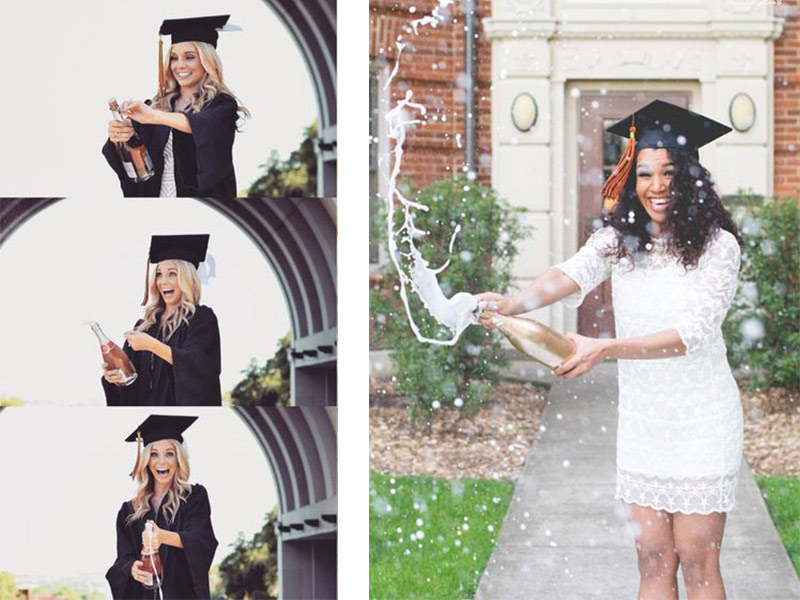 Una foto increíble para tu graduación puede ser con ayuda de una botella de vino espumoso. La idea base es celebrar por un logro más en tu vida, así que no pasa nada si capturan el momento desde que intentas quitar el corcho hasta que el líquido se empiece a esparcir.