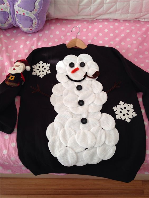 Para una opción rápida y elegante, toma una sudadera blanca y pega botones negros en línea vertical. Añade una nariz de zanahoria y ojos de carbón con fieltro. Resulta simple, efectivo y muy navideño.