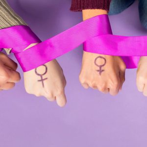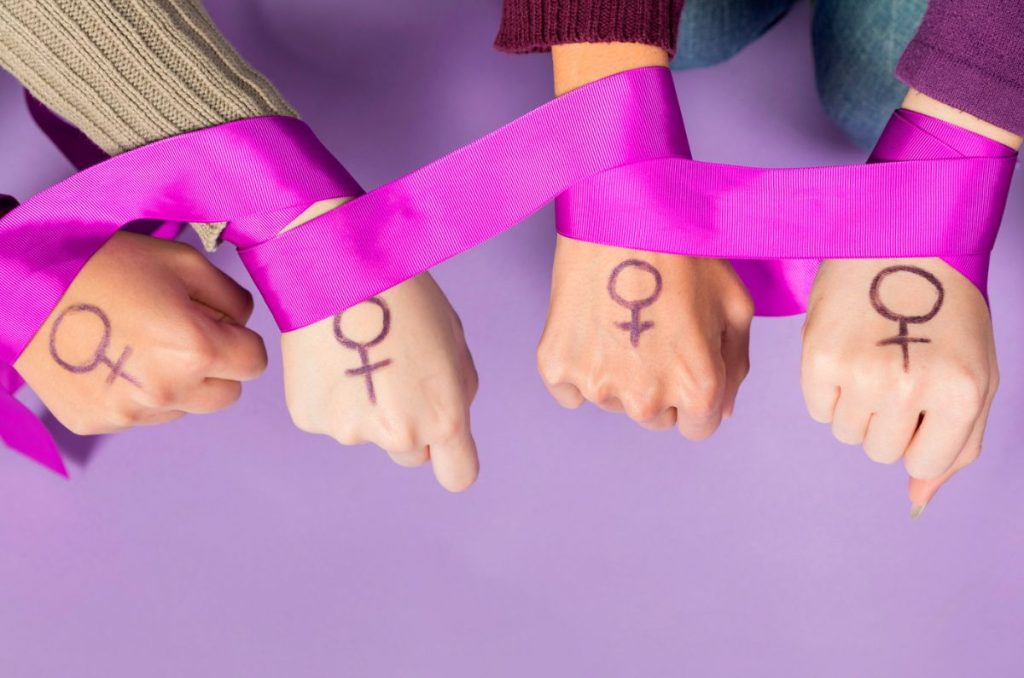Imagen conceptual de cuatro mujeres con el símbolo feminista dibujado en las manos y unidas por un listón rosa, representando la sororidad y la fuerza de las mujeres mexicanas protagonistas de documentales sociales y feministas.