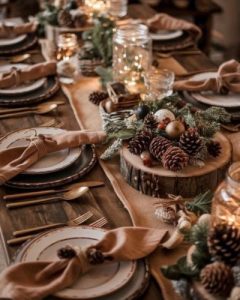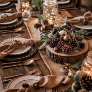 Centrros de mesa rústicos con piñas y tonos tierra