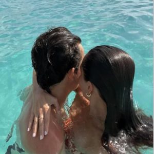 Imagen de una pareja dentro del agua cristalina abrazándose y compartiendo un momento íntimo. El entorno natural y el color turquesa del mar evocan romanticismo y conexión, perfecta para ilustrar destinos ideales para viajar en pareja.