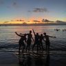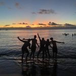 Imagen en silueta de un grupo de personas en la orilla del mar al atardecer. El cielo presenta tonos cálidos y el agua refleja la luz del sol. La escena transmite alegría, conexión y celebración, perfecta para ilustrar viajes en pareja, con amigos o en familia durante Semana Santa.