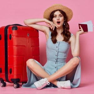 Imagen de una mujer joven sentada sobre un fondo rosa, con una maleta roja de viaje a su lado. Lleva vestido azul claro, sombrero de paja y tenis blancos, mientras sostiene un pasaporte y boletos de avión en la mano. La fotografía transmite emoción y preparación para unas vacaciones, ideal para ilustrar un artículo sobre destinos para viajar en Semana Santa en México.