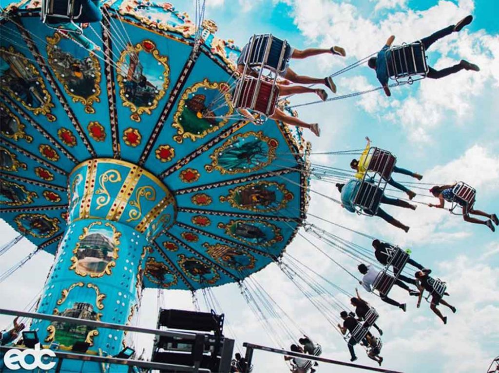 En el festival EDC 2020, los juegos como las sillas voladoras suman diversión y adrenalina, creando momentos inolvidables para todos los asistentes