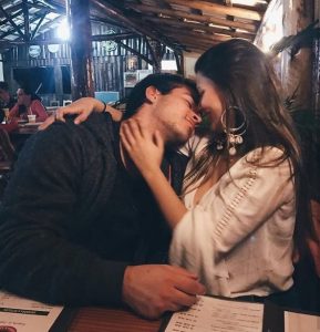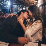 Una escena íntima de una pareja que sonríe y se acaricia en un restaurante, símbolo de un amor duradero y frases que celebran los años compartidos
