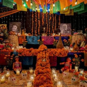 Altar de muertos con comida tradicional y decorada con flores de cempasúchil y papel picado