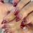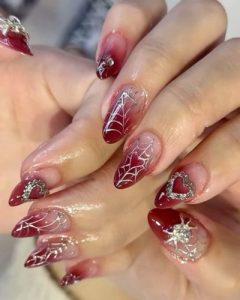 Manicura con efecto degradado en color rojo y detalles metálicos de telarañas y arañas