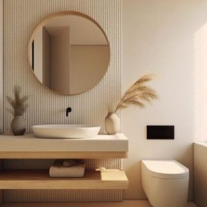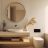 Lavabo blanco sobre mueble de madera y espejo redondo