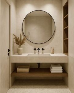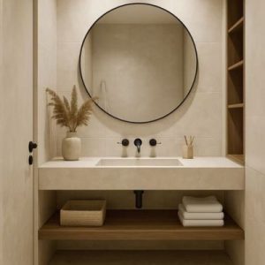 Baño minimalista en tonos neutros claros