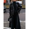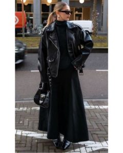 Total look negro con chamarra de piel en color negro, falda midi suelta y suéter de cuello alto negro