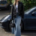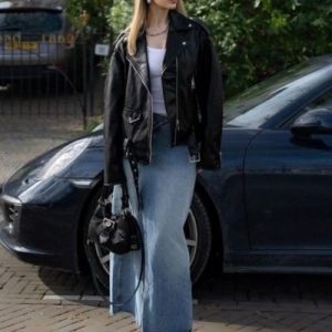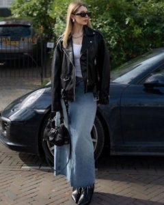 Outfit con falda midi de mezclilla, blusa blanca y chaquera de cuero en color negro