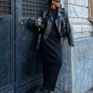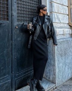 Total look negro con chaqueta de cuero en color negro y vestido corte midi