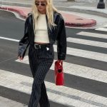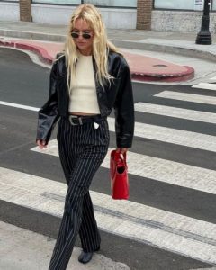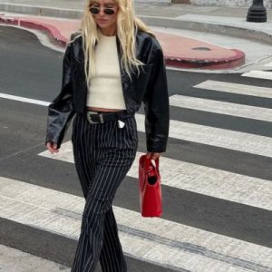 Look casual con pantalones de raya a la cintura, blusa blanca y chaqueta de cuero en color negra
