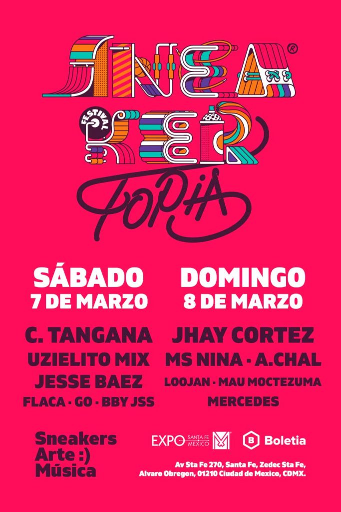 Póster informativo de Sneakertopia 2020 en rosa mexicano, mostrando las fechas de presentación de cada artista