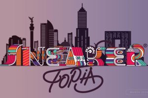 Imagen conceptual de SneakerTopia, mostrando el logo colorido y la ciudad de fondo, representando el festival de música urbana para sneakerheads