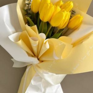 Ramo de tulipanes amarillos enrollados en papel blanco y amarillo mantequilla