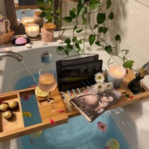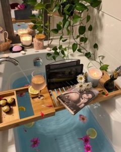 Baño preparado con agua azul, flores flotando y rodajas de limón, velas encendidas, plantas colgantes y una tabla sobre la tina con libro, bebida y chocolates. La escena representa un ritual de cierre del día enfocado en descanso consciente, detox digital y amor propio.