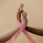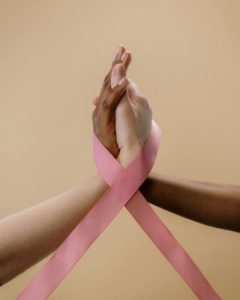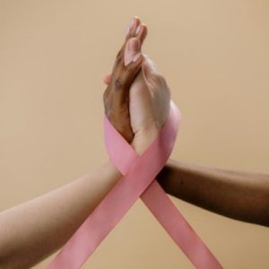 Dos manos de diferentes tonos de piel se sostienen firmemente mientras un lazo rosa las envuelve, representando solidaridad, acompañamiento y fuerza compartida frente al cáncer de mama.