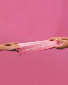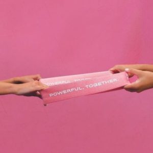 Dos manos estiran una banda elástica rosa con el mensaje “Powerful. Together.” sobre un fondo rosa, simbolizando fuerza colectiva y empoderamiento femenino frente al cáncer.