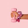 Una mujer sostiene una mancuerna rosa mientras lleva una scrunchie del mismo tono en la muñeca, representando la importancia de la actividad física como parte del autocuidado y la prevención.