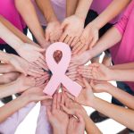 Un grupo de mujeres extiende sus manos hacia el centro formando un círculo alrededor de un lazo rosa. La imagen representa la solidaridad, la prevención y la concientización sobre el cáncer de mama y otros tipos de cáncer que afectan a las mujeres.